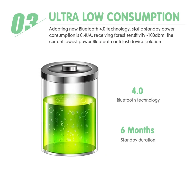6. Adopt Bluetooth new 4.0 technology power consumption is very low, button battery CR2032 power supply, support IOS system and ANDROID 4.3 or above system (Bluetooth 4.0), anti-lost device appearance is beautiful and stylish.