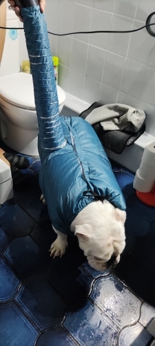 Turn blow dryer on Warm or Low heat and the air speed to high. The pet dog dryer will puff out. Air should vent through leg openings, neck and tail.
