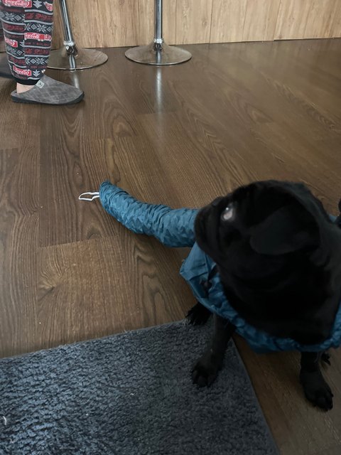 Put front paws into the leg holes and back paws into leg holes. It may be easier to put your hand up through the hole and pull the paw through.
