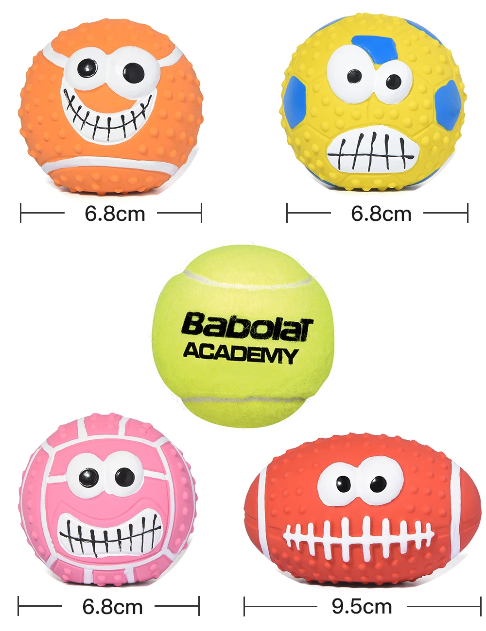 Balls for Medium Small Pets: Includes 4 different sports balls (basketball, football, volleyball and rugby) which are about 2.7″ in diameter (size of a standard tennis ball), perfect for medium small dogs. We provide refund or replacement within 30 days. Please contact us with any questions.